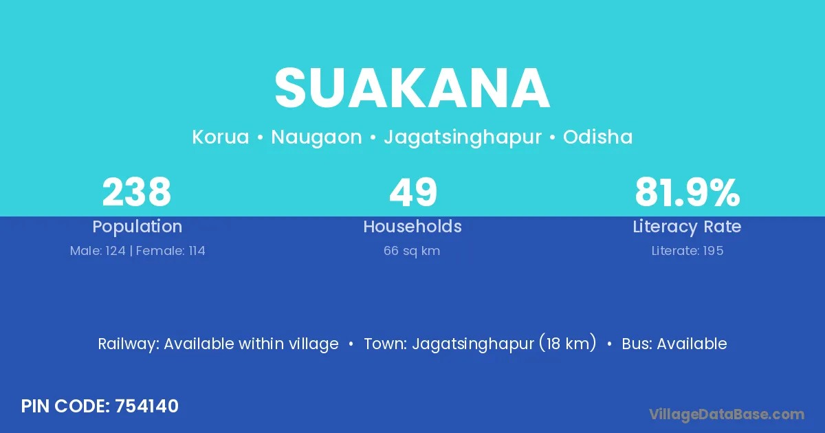 Jagatsinghapur (18 km) is the nearest town to Suakana village for major economic activities and is located approximately 18 km away.