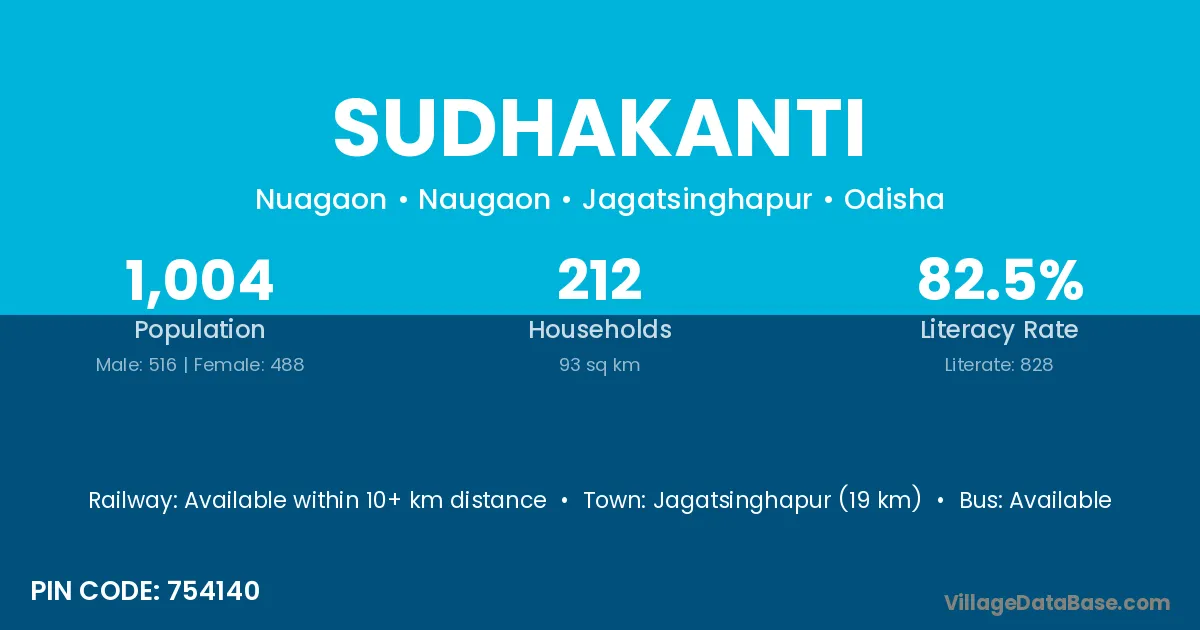 Jagatsinghapur (19 km) is the nearest town to Sudhakanti village for major economic activities and is located approximately 19 km away.