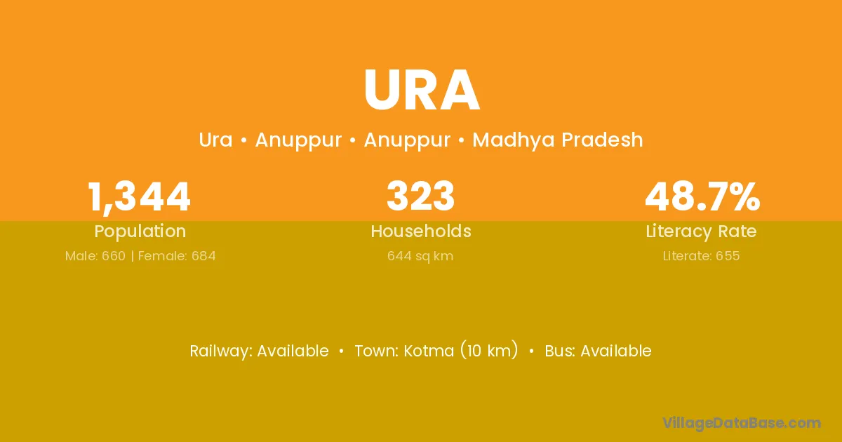 The literacy rate of Ura village is 80.68%. Male literacy stands at 88.99% and female literacy at 73.60%.