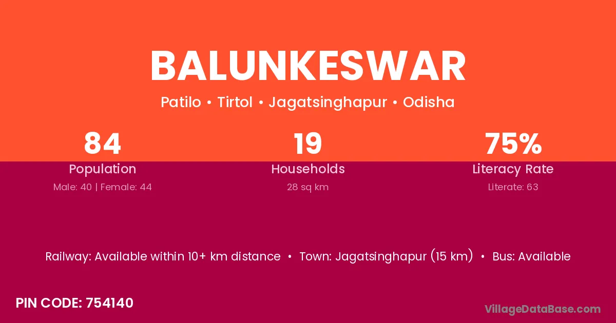 Balunkeswar village has a total population of 84 people, of which 40 are males and 44 are females.