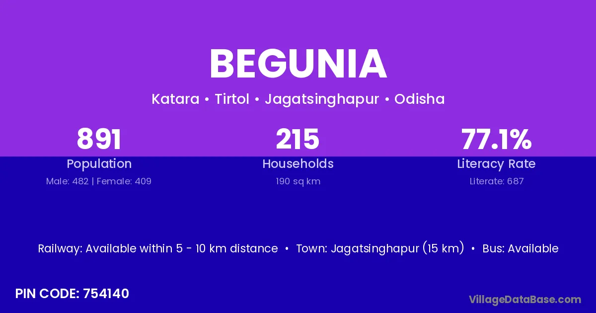 Jagatsinghapur (15 km) is the nearest town to Begunia village for major economic activities and is located approximately 15 km away.