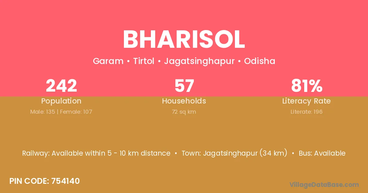 Jagatsinghapur (34 km) is the nearest town to Bharisol village for major economic activities and is located approximately 34 km away.