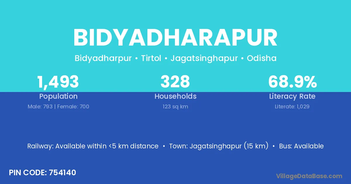 Jagatsinghapur (15 km) is the nearest town to Bidyadharapur village for major economic activities and is located approximately 15 km away.
