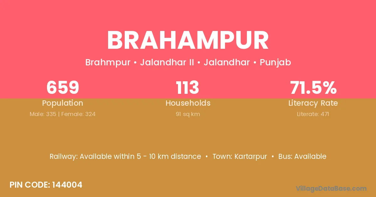 Brahampur village has a total population of 128 people, of which 69 are males and 59 are females.