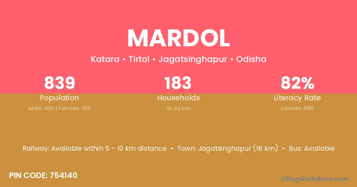 Jagatsinghapur (16 km) is the nearest town to Mardol village for major economic activities and is located approximately 16 km away.