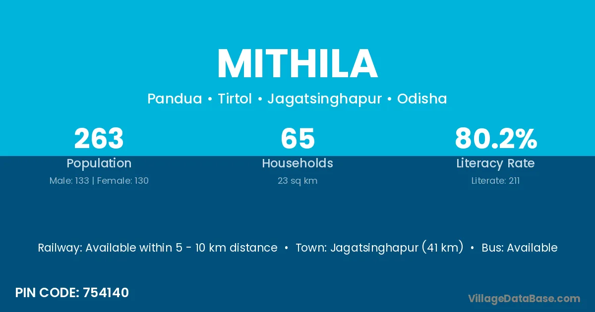 Jagatsinghapur (41 km) is the nearest town to Mithila village for major economic activities and is located approximately 41 km away.
