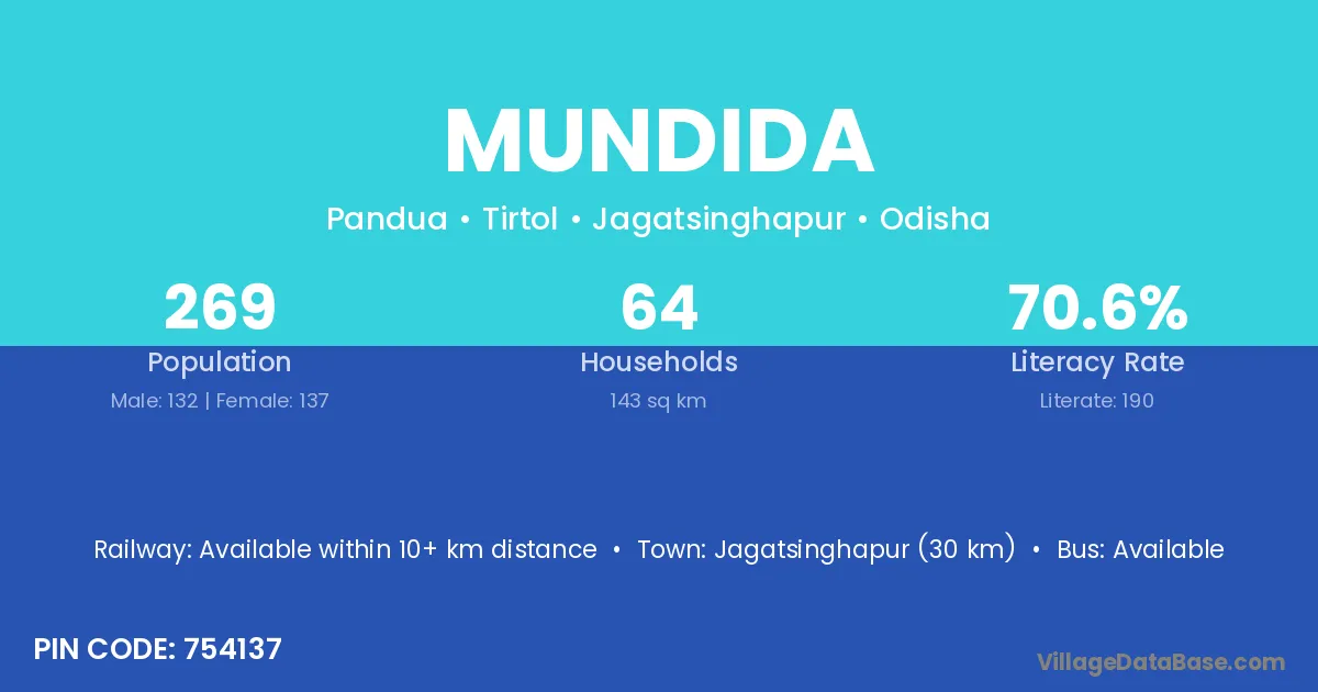 Jagatsinghapur (30 km) is the nearest town to Mundida village for major economic activities and is located approximately 30 km away.