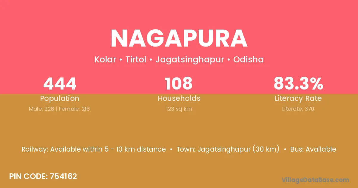 Jagatsinghapur (30 km) is the nearest town to Nagapura village for major economic activities and is located approximately 30 km away.
