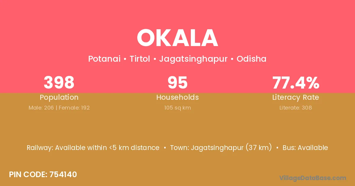 Jagatsinghapur (37 km) is the nearest town to Okala village for major economic activities and is located approximately 37 km away.