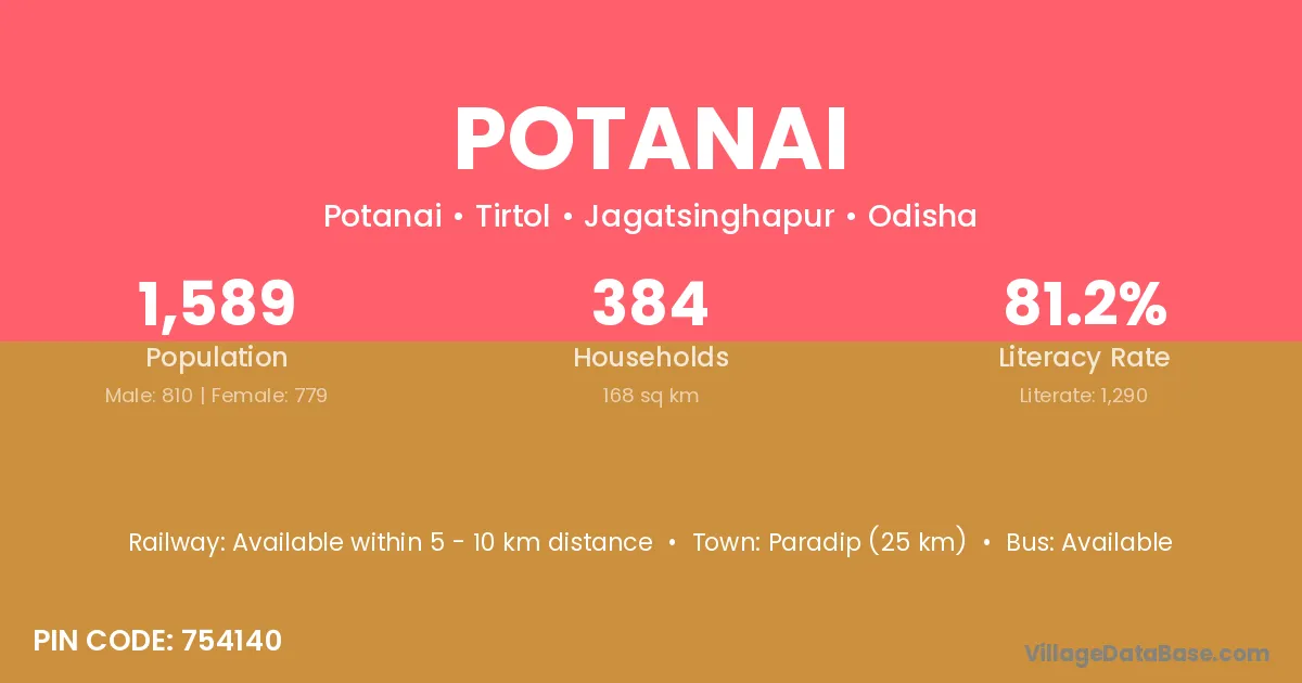 Paradip (25 km) is the nearest town to Potanai village for major economic activities and is located approximately 25 km away.