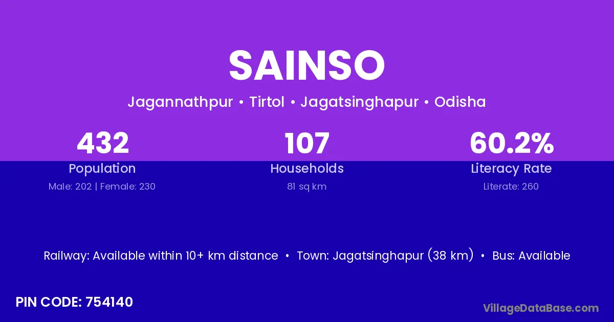 Jagatsinghapur (38 km) is the nearest town to Sainso village for major economic activities and is located approximately 38 km away.