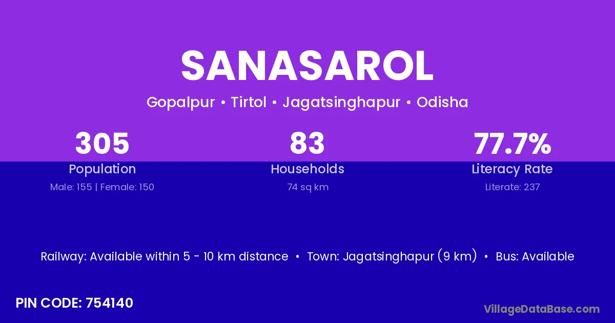 Jagatsinghapur (9 km) is the nearest town to Sanasarol village for major economic activities and is located approximately 9 km away.