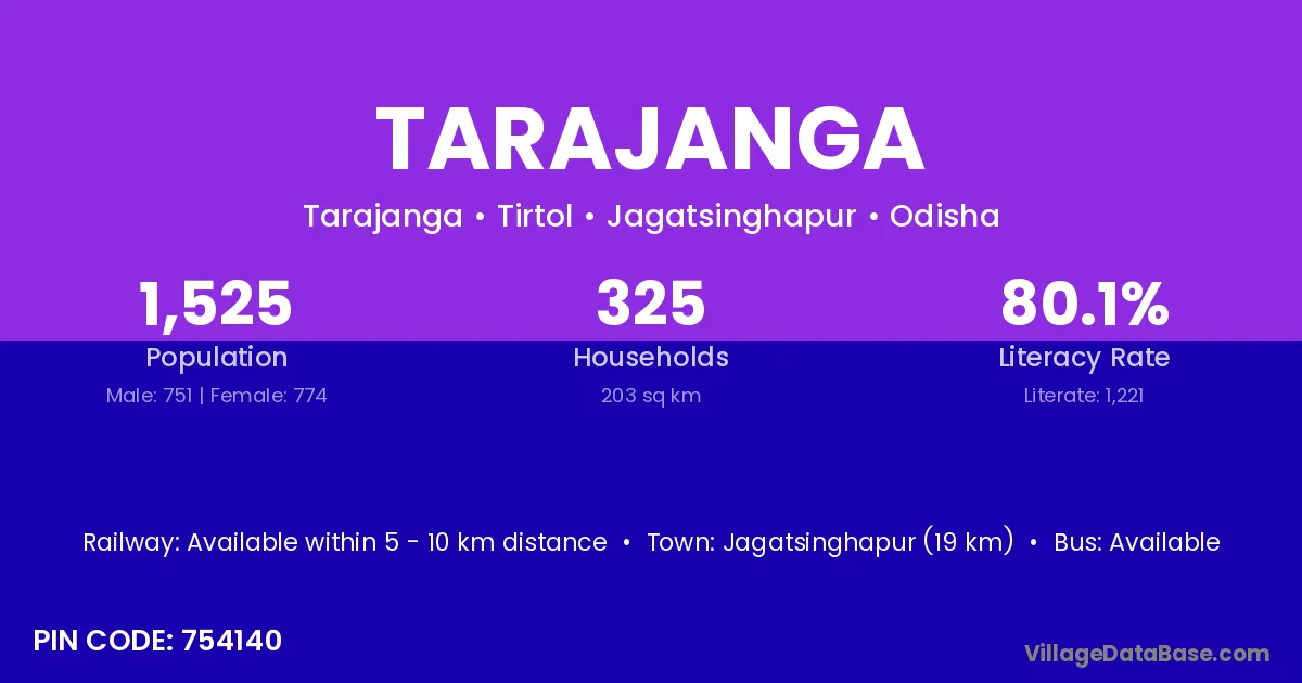 Jagatsinghapur (19 km) is the nearest town to Tarajanga village for major economic activities and is located approximately 19 km away.