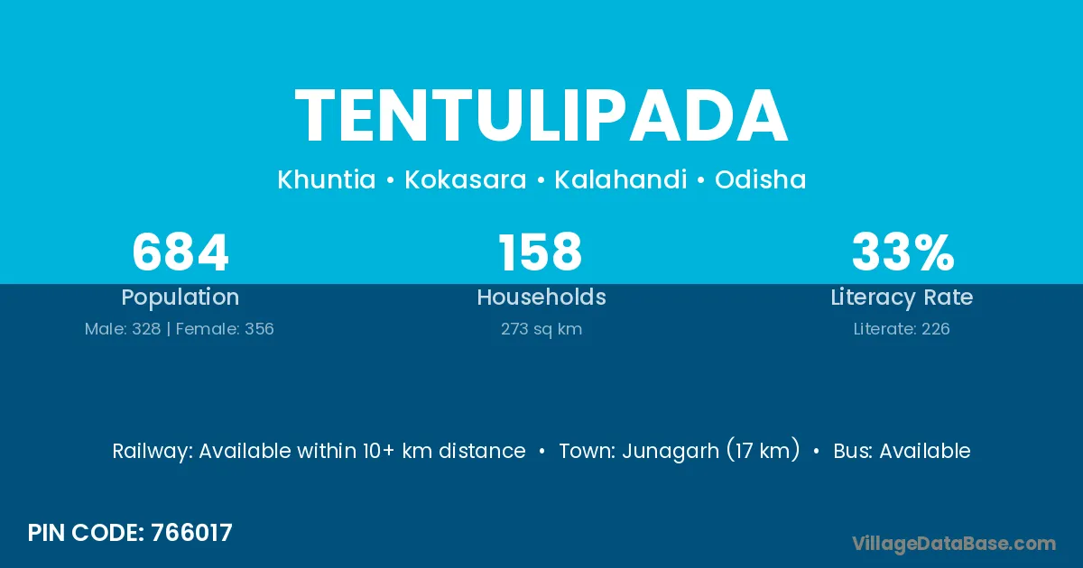 Jagatsinghapur (20 km) is the nearest town to Tentulipada village for major economic activities and is located approximately 20 km away.