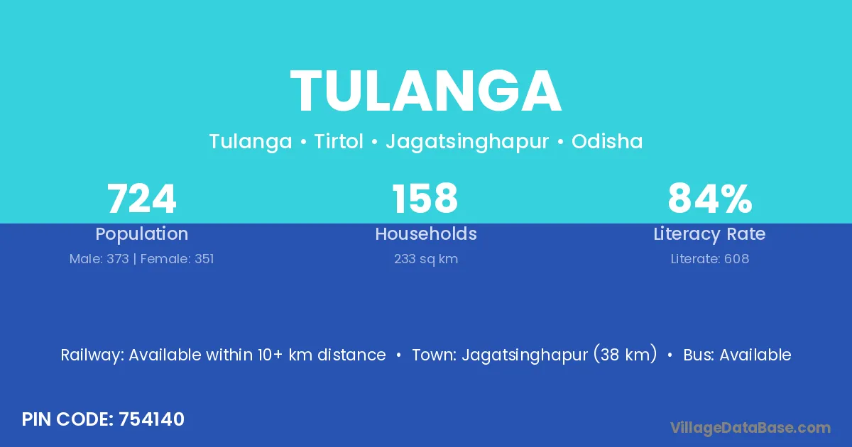 Jagatsinghapur (38 km) is the nearest town to Tulanga village for major economic activities and is located approximately 38 km away.