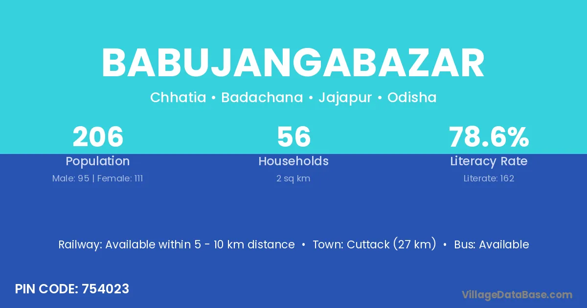 Cuttack (27 km) is the nearest town to Babujangabazar village for major economic activities and is located approximately 27 km away.