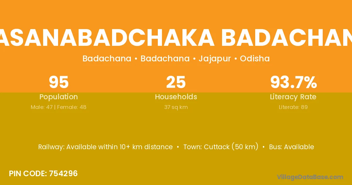 Hasanabadchaka Badachana village has a total population of 95 people, of which 47 are males and 48 are females.