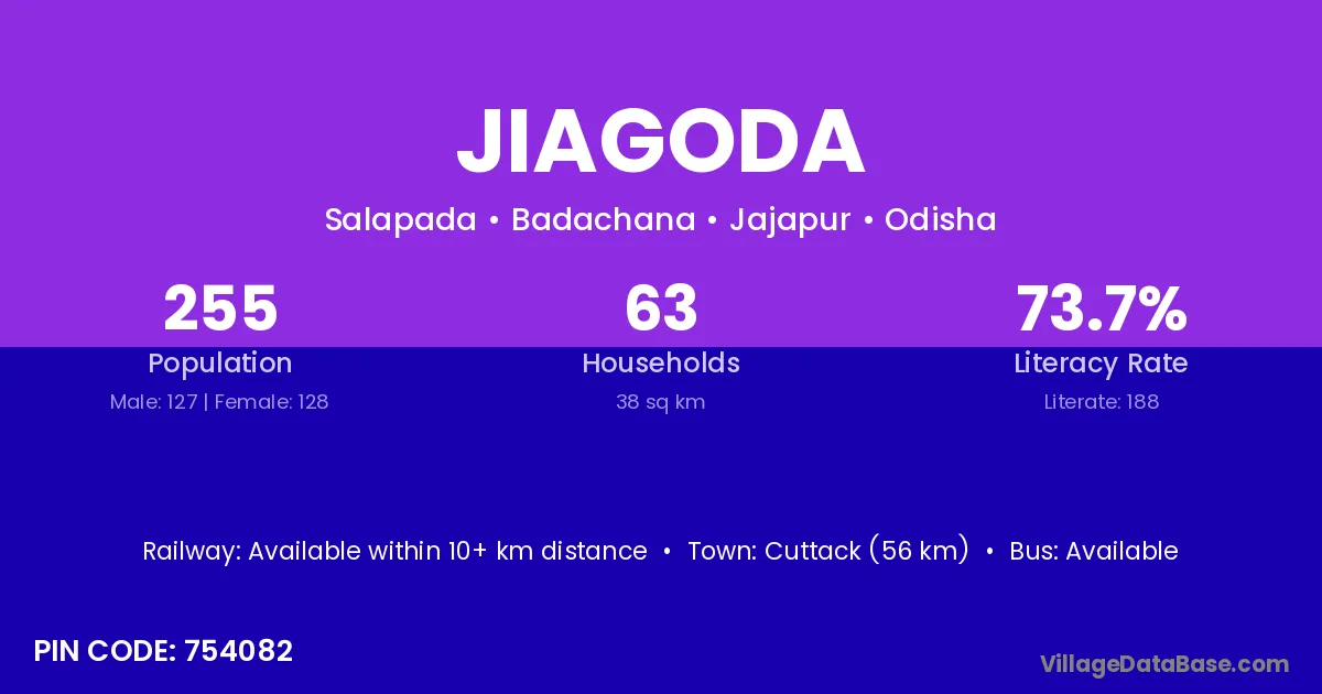 Cuttack (56 km) is the nearest town to Jiagoda village for major economic activities and is located approximately 56 km away.