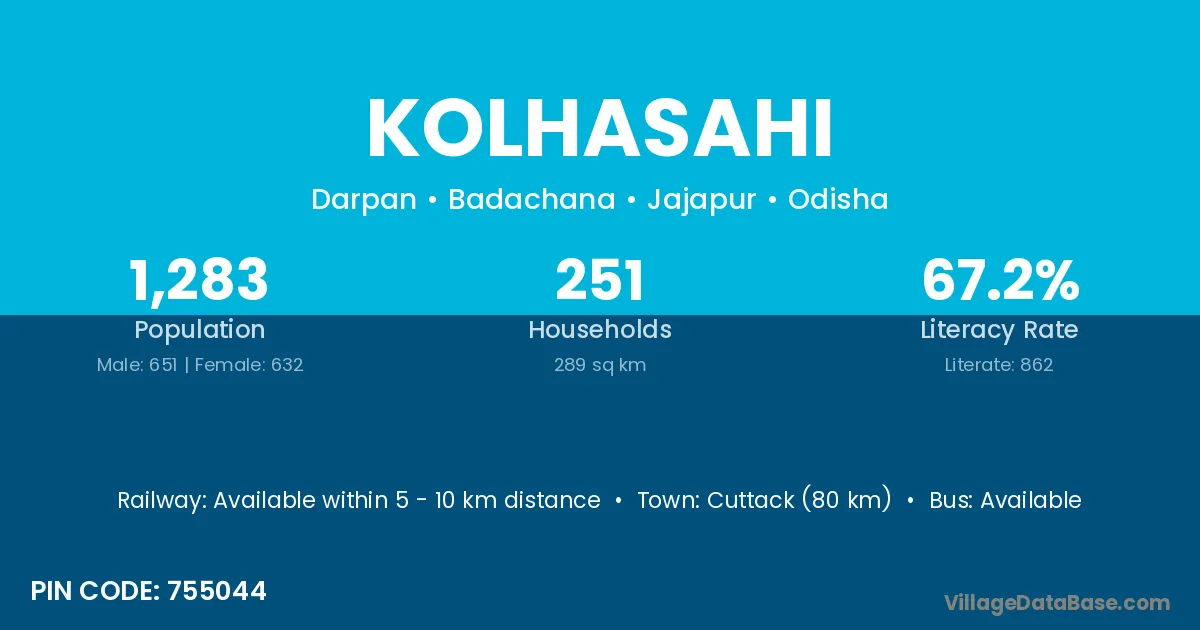 Cuttack (80 km) is the nearest town to Kolhasahi village for major economic activities and is located approximately 80 km away.