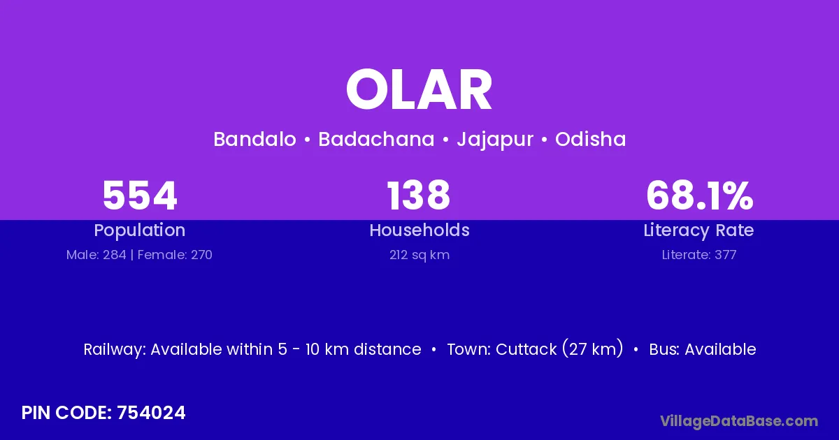 Cuttack (27 km) is the nearest town to Olar village for major economic activities and is located approximately 27 km away.