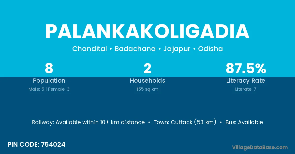 Cuttack (53 km) is the nearest town to Palankakoligadia village for major economic activities and is located approximately 53 km away.