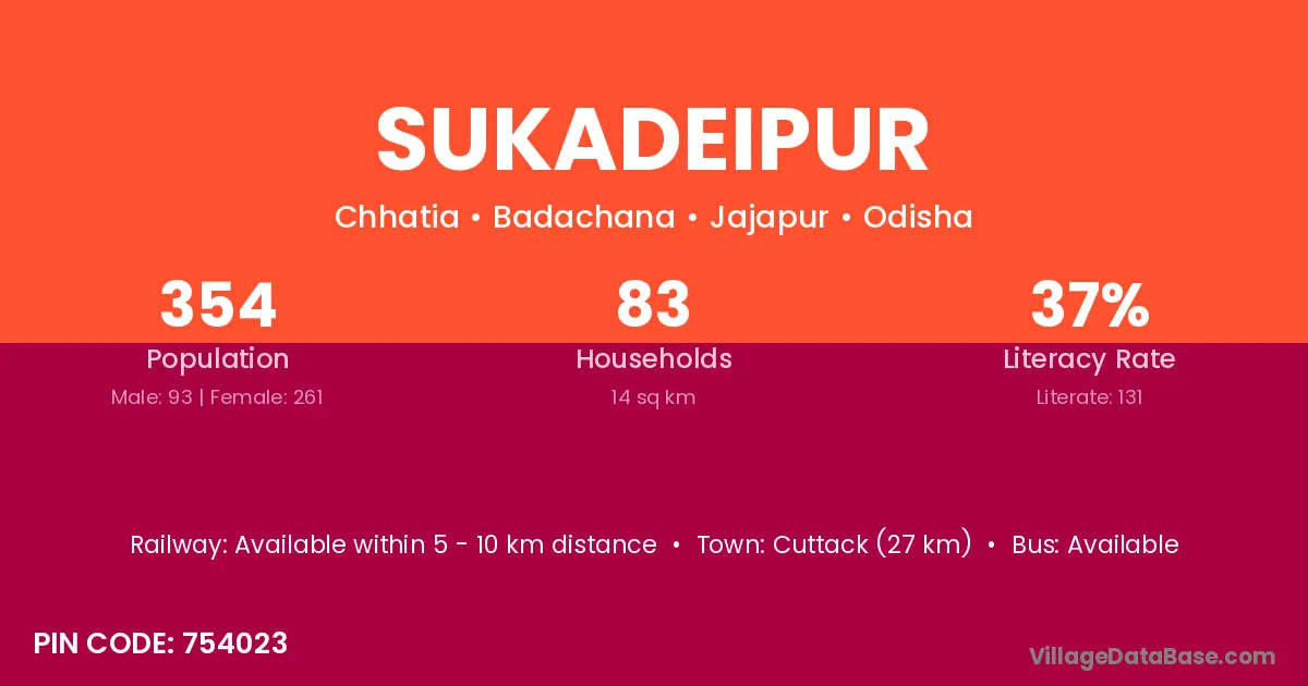 Cuttack (27 km) is the nearest town to Sukadeipur village for major economic activities and is located approximately 27 km away.
