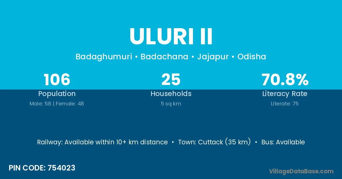 Cuttack (35 km) is the nearest town to Uluri Ii village for major economic activities and is located approximately 35 km away.