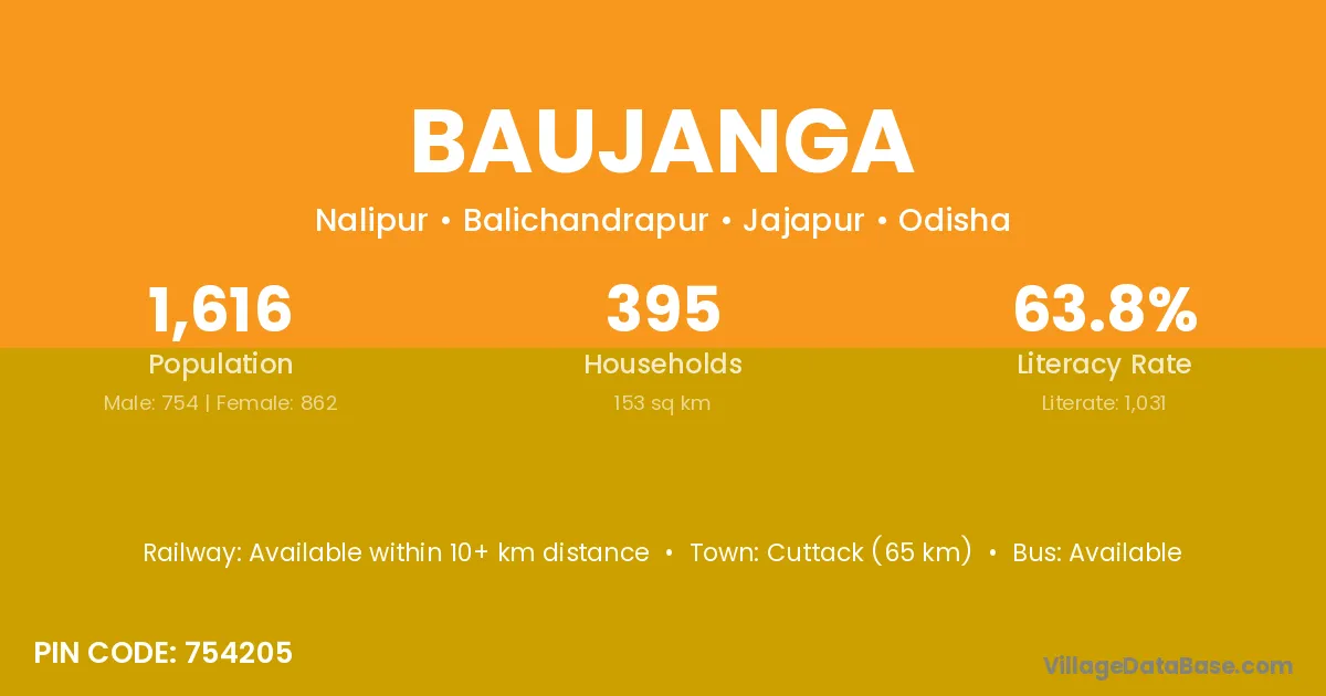 Cuttack (65 km) is the nearest town to Baujanga village for major economic activities and is located approximately 65 km away.