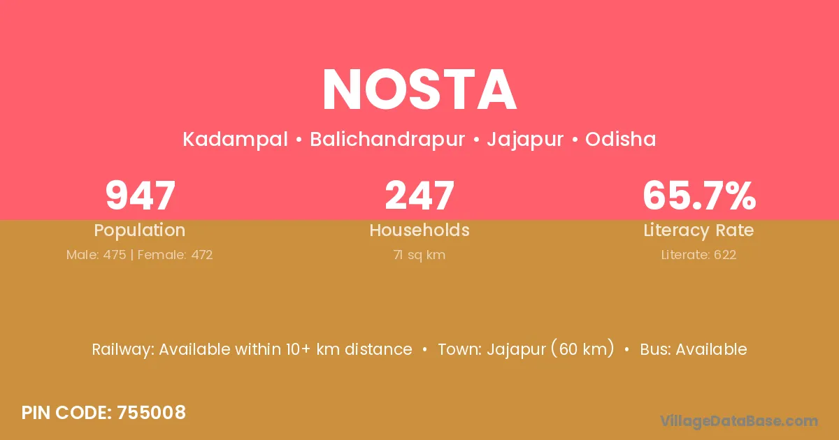 Jajapur (60 km) is the nearest town to Nosta village for major economic activities and is located approximately 60 km away.
