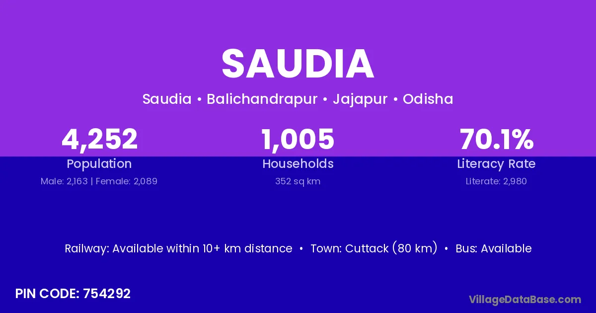 Cuttack (80 km) is the nearest town to Saudia village for major economic activities and is located approximately 80 km away.