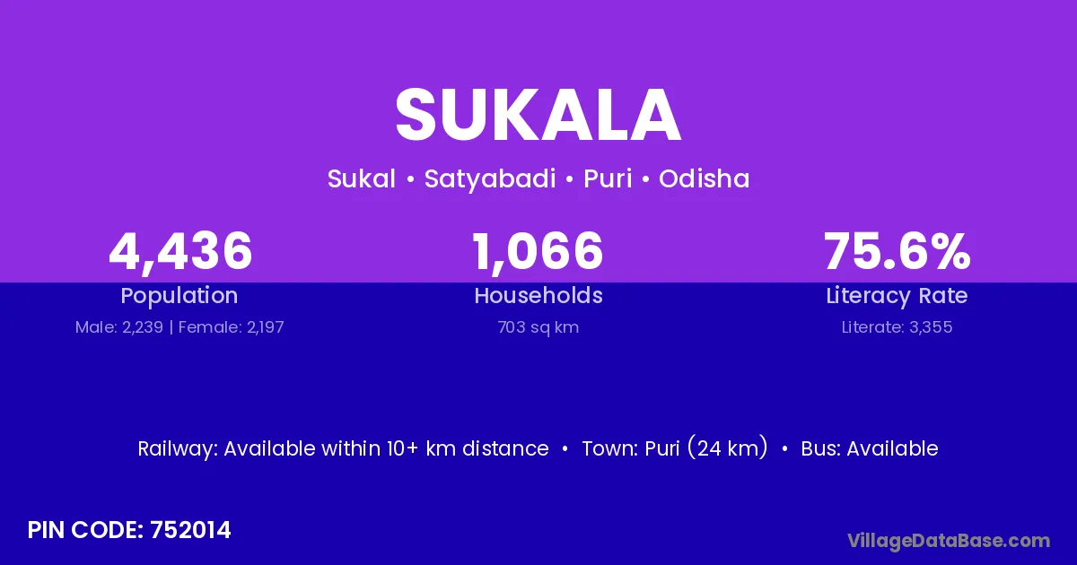 Jajapur (85 km) is the nearest town to Sukala village for major economic activities and is located approximately 85 km away.