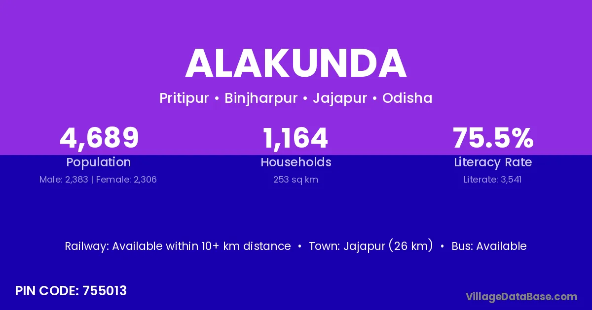 Jajapur (26 km) is the nearest town to Alakunda village for major economic activities and is located approximately 26 km away.