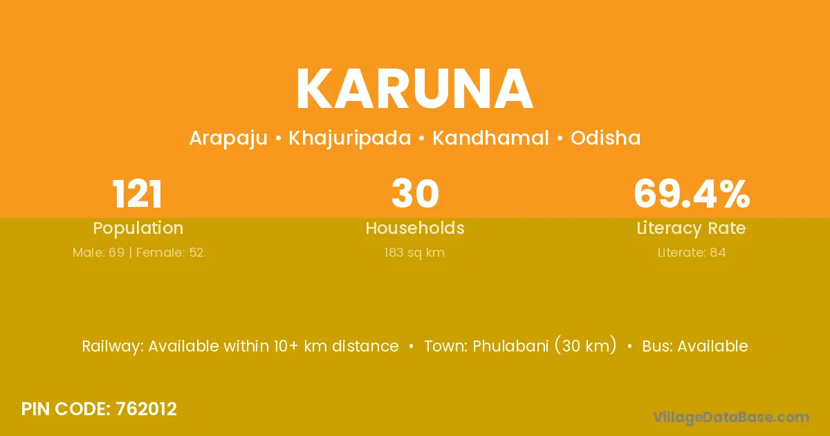Jajapur (12 km) is the nearest town to Karuna village for major economic activities and is located approximately 12 km away.