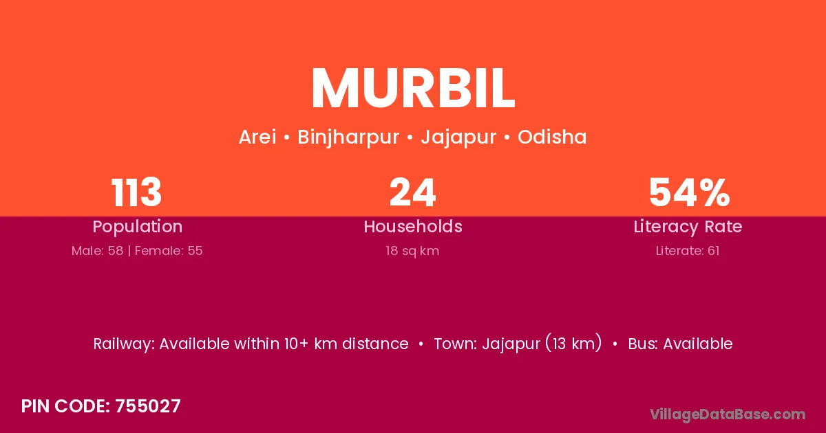 Murbil village has a total population of 113 people, of which 58 are males and 55 are females.