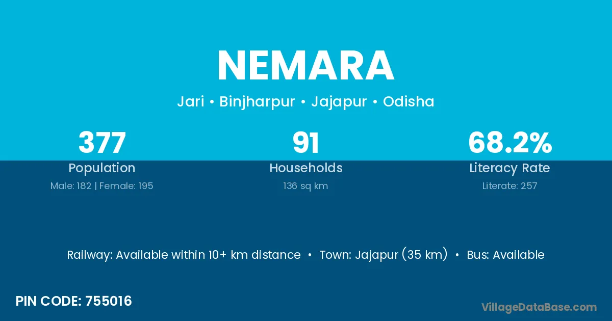 Jajapur (35 km) is the nearest town to Nemara village for major economic activities and is located approximately 35 km away.