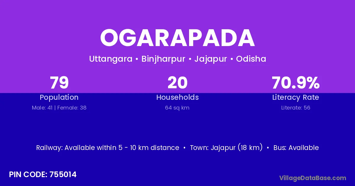Jajapur (18 km) is the nearest town to Ogarapada village for major economic activities and is located approximately 18 km away.