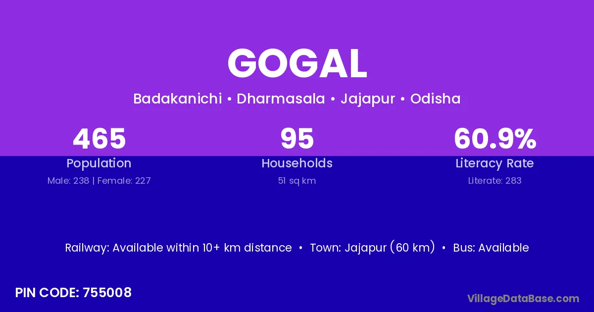 Jajapur (60 km) is the nearest town to Gogal village for major economic activities and is located approximately 60 km away.