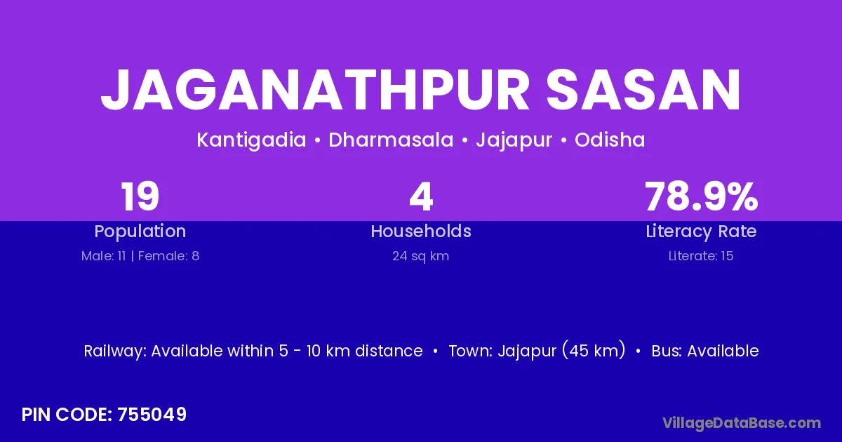 Jaganathpur Sasan village has a total population of 19 people, of which 11 are males and 8 are females.