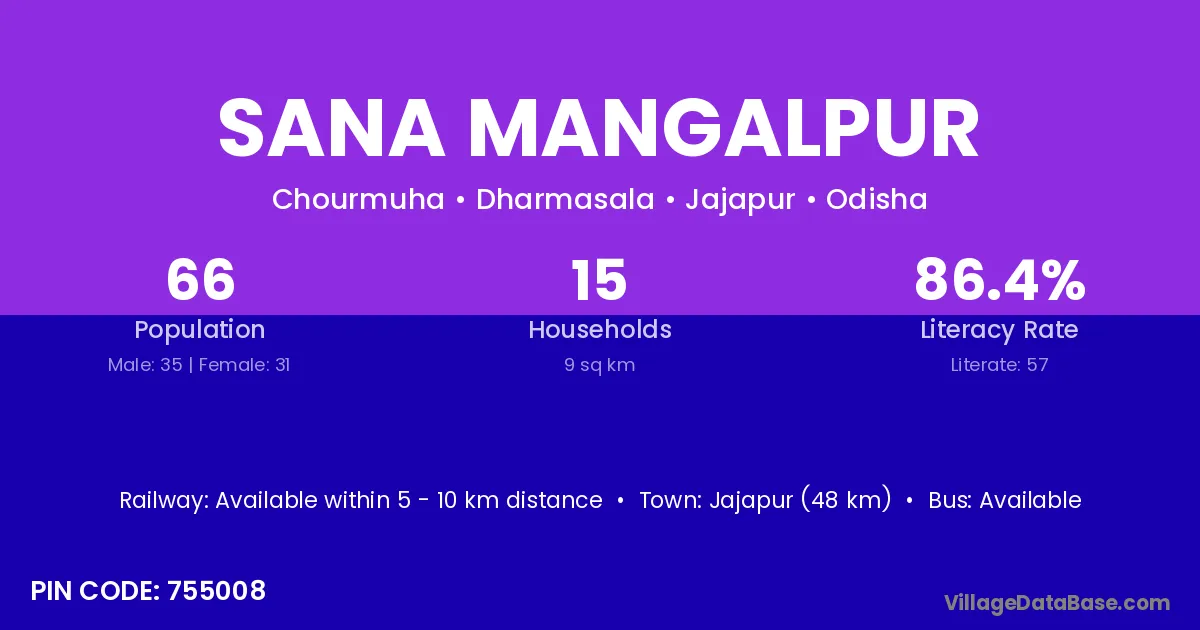 Jajapur (48 km) is the nearest town to Sana Mangalpur village for major economic activities and is located approximately 48 km away.
