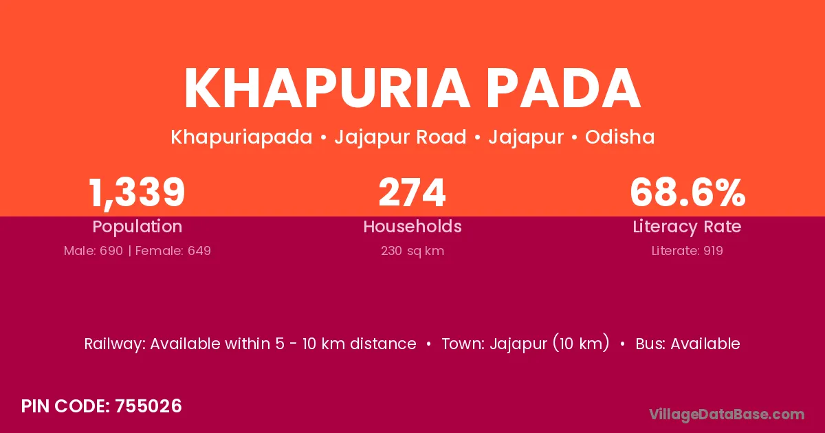 Khapuria Pada village has a total population of 1,339 people, of which 690 are males and 649 are females.