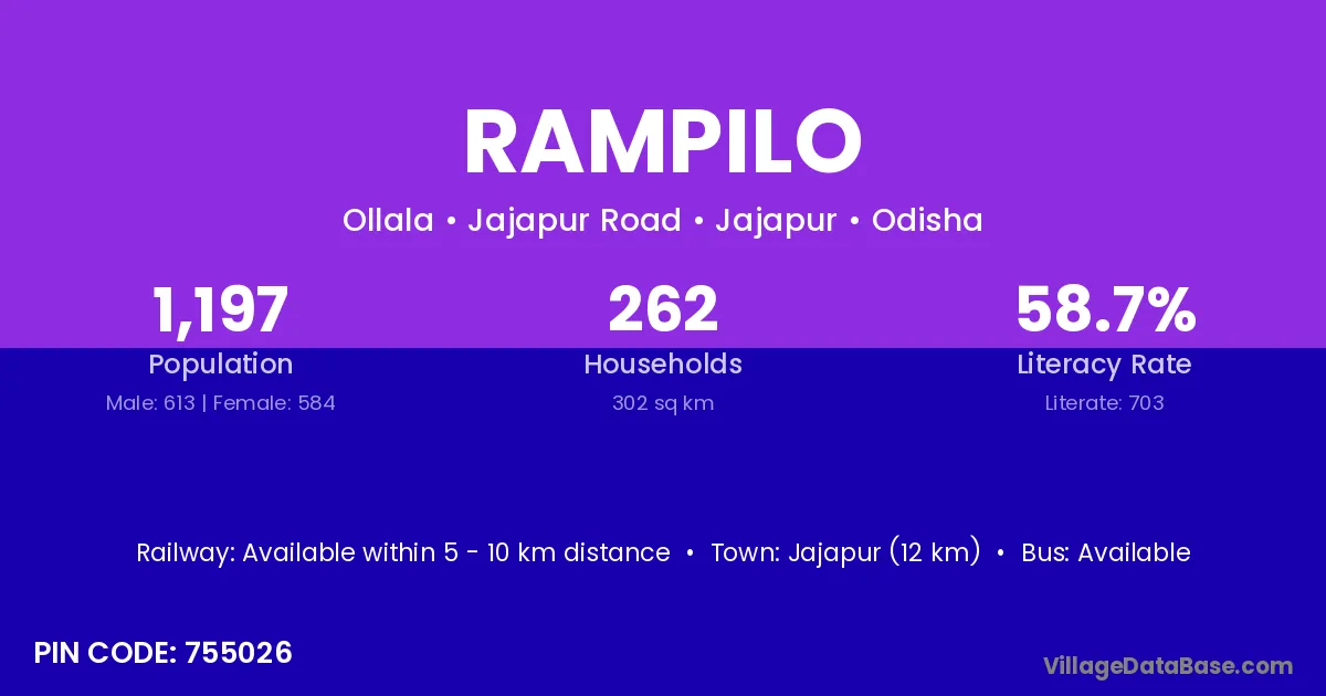 Jajapur (12 km) is the nearest town to Rampilo village for major economic activities and is located approximately 12 km away.