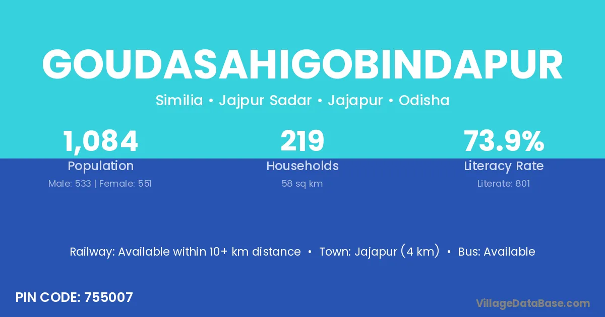 Goudasahigobindapur village has a total population of 1,084 people, of which 533 are males and 551 are females.