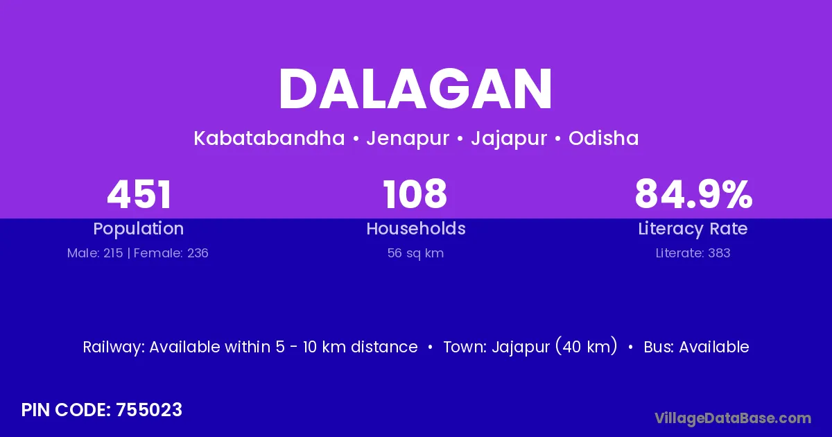Jajapur (40 km) is the nearest town to Dalagan village for major economic activities and is located approximately 40 km away.
