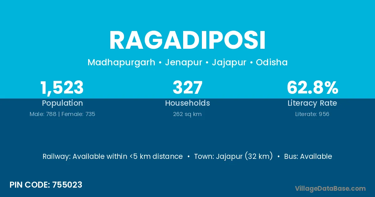 Jajapur (32 km) is the nearest town to Ragadiposi village for major economic activities and is located approximately 32 km away.