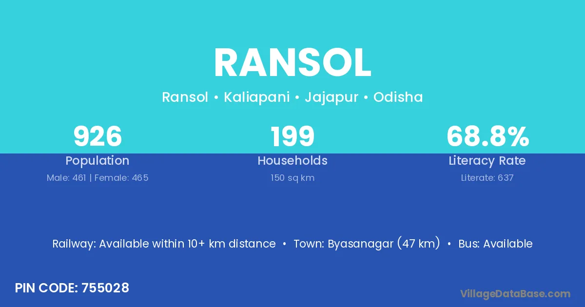 Byasanagar (47 km) is the nearest town to Ransol village for major economic activities and is located approximately 47 km away.