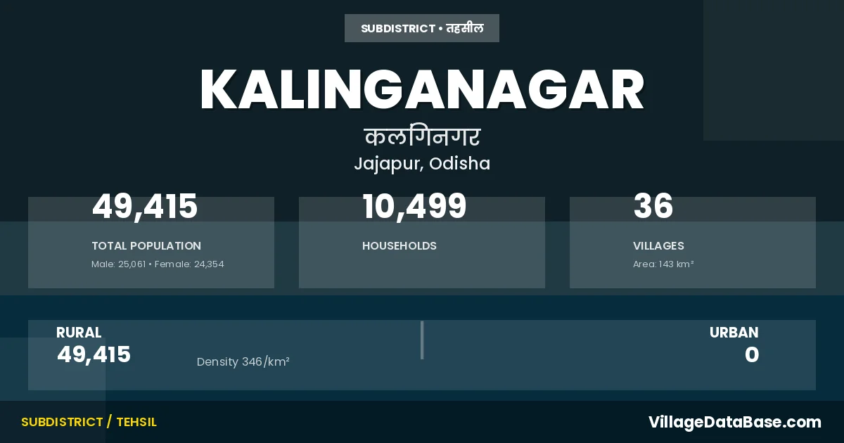 According to the 2011 census The total area of Kalinganagar Tehsil is 143 km², with a population of 49415 people. The population density is 346 inhabitants per square kilometre, and there are approximately 10499 houses in the sub district.