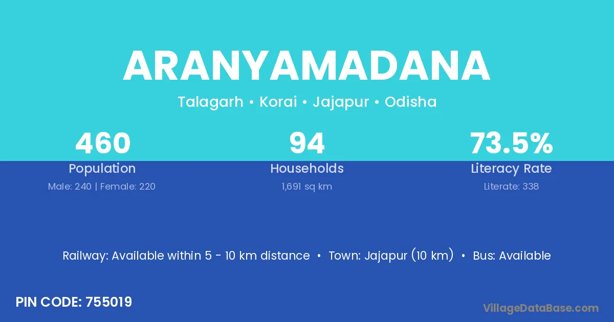 Jajapur (10 km) is the nearest town to Aranyamadana village for major economic activities and is located approximately 10 km away.