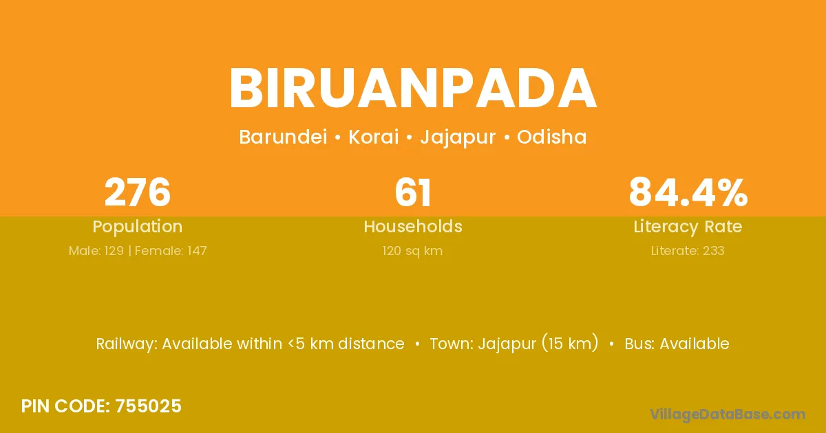 Jajapur (15 km) is the nearest town to Biruanpada village for major economic activities and is located approximately 15 km away.