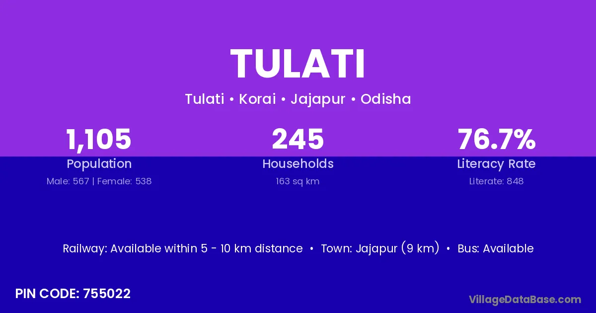 Jajapur (9 km) is the nearest town to Tulati village for major economic activities and is located approximately 9 km away.