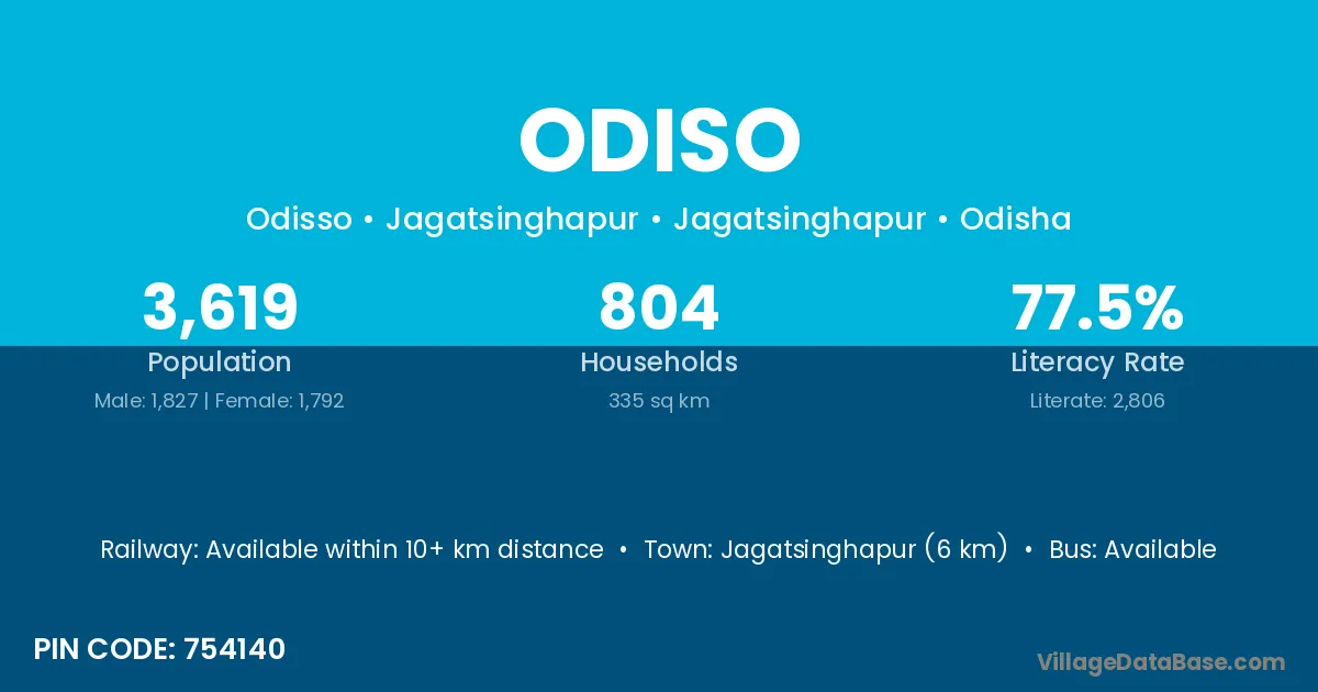 Jajapur (22 km) is the nearest town to Odiso village for major economic activities and is located approximately 22 km away.